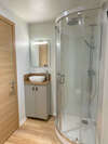 Meuble de rangement intégrant WC suspendu Geberit, lavabo avec miroir éclairant, cabine de douche Kinedo, 1 prise sèche-cheveux, ventilation mécanique